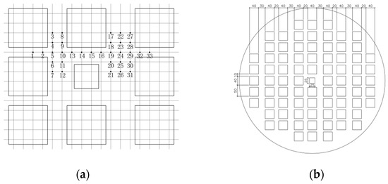 Figure 4. Detailed diagram of pedestrian wind environment wind tunnel test. (a) Layout of measurement points for pedestrian wind environment. (b) Plan view of building model used in wind tunnel test for pedestrian wind environment.