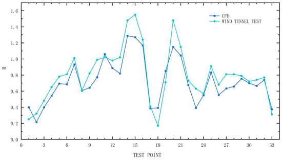 The simulation model was verified using wind tunnel experimental data from the Architectural Institute of Japan (AIJ) guidelines, as proposed by Tominaga et al. [34]. The dimensions of the central building in the model are 25 m × 25 m × 100 m, while the surrounding buildings are prototypically sized at 40 m × 40 m × 10 m, as shown in Figure 4. Wind speed measurements were carried out using an improved Irwin-type anemometer, with the probe installed at a height of 5 mm, representing a full-scale height of 1.5 m [35].