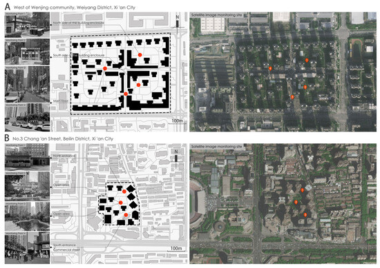First, building spatial data for CASE A and CASE B, including layouts, density, and height, were collected to construct 3D building models (Figure 3). Topographic data of Xi’an, covering buildings, road networks, and public spaces, were also obtained to support spatial analysis. The selected cases represent two common high-rise residential typologies in Chinese cities: CASE B features a high-density (FAR = 6.93), linear “row-type” layout, while CASE A reflects a medium-density (FAR = 2.63), enclosed “courtyard-type” configuration. The selection was based on their planning representativeness, coverage of typical FAR ranges (from mid- to super-high density), and observed PM2.5 accumulation during winter. CASE A’s compact blocks generate localized low wind zones, while CASE B’s enclosed form creates a broader weak-wind region, both contributing to pollution retention and health-related wind vulnerability under adverse climatic conditions.
