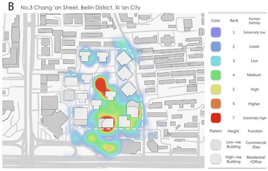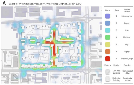 To support human activity analysis, POI data from the two cases were collected, including information such as residential area names, building heights, and functional types. The data were cleaned and classified to facilitate spatial analysis. The data were cleaned and classified to facilitate spatial analysis. The raw POI data used in this study are publicly available and can be downloaded from: https://lbs.amap.com (see Supplementary Materials). Kernel density analysis and buffer analysis were employed to identify hotspots of human activity and evaluate human aggregation patterns within various distance ranges.
