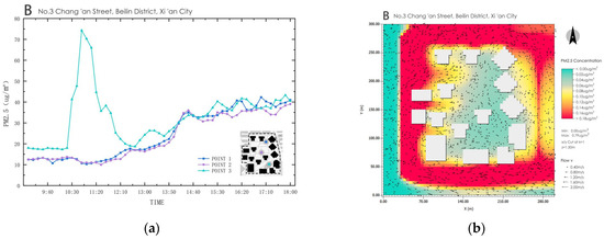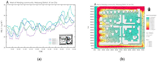 Finally, on-site monitoring of PM2.5 concentrations was conducted during the winter season to capture variations in air quality across different time periods. Multiple monitoring points were established for CASE A and CASE B, covering key areas such as building clusters, courtyards, and main pedestrian pathways. The collected PM2.5 data underwent cleaning and preprocessing to remove outliers and noise, ensuring the reliability of the dataset for subsequent analysis.