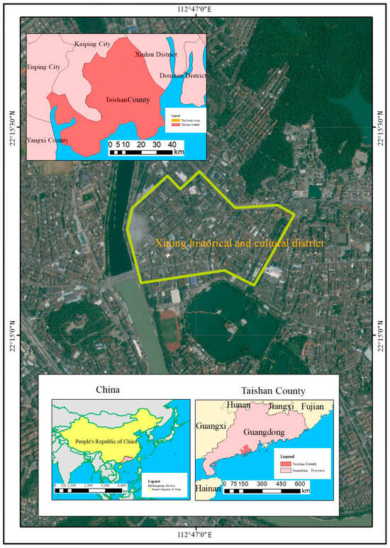 This study was conducted in the Xining historical and cultural district in Taishan County, Jiangmen City, Guangdong Province, China (Figure 2). Taishan County is a renowned hometown of overseas Chinese in China. Its central towns and small urban areas have undergone modern municipal improvements in the Republic of China, showing typical regional features with arcade buildings as the main feature. In 1924, Taishan County was granted by Sun Yat-sen to implement local autonomy. The urban texture of the Xining historical and cultural district is highly distinctive. It was planned as a new urban district of the county town, adopting a grid layout to integrate the originally separate Xining Market and Ximen Xu (West Gate Market) outside the old county town. Roads and buildings were uniformly standardized in planning and construction, with all old structures along the streets demolished and replaced by commercial arcade buildings, merging the original “one town, two markets” pattern into a cohesive development. As the essential route connecting the old urban area and the Xining Railway Station, the Xining historical and cultural district experienced rapid urban expansion driven by robust overseas Chinese investment in commerce. Within the district, arcade buildings with diverse Western-style facades stand in great numbers, showing a unique blend of Chinese and Western architectural charm, and it is still the most prosperous part of Taishan County, gathering many important public buildings and residences of prominent people. The district also preserves many buildings with modern architectural heritage, such as the Tianqiao Building, the church, and the Taixi Business Council, while traditional buildings remain well preserved.