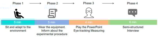 The experiment was carried out in a bright room to eliminate the interference of outdoor light sources and was carried out in the form of a PowerPoint presentation. After the participant wore an eye tracker and calibrated it, the warm-up pictures were played to eliminate interference from the participants’ eye movements. Then, four groups of experimental photos were played according to urban texture, public building, arcade building, and partial elevation. Each photo was played for 10 s with a 4 s interval, and with an 8 s gray image at the end of each set to alleviate visual fatigue; the playback time lasted for nearly four minutes (Figure 3).