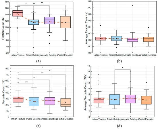 The observers exhibited significant differences in FC and SC for urban texture visual perception compared to the other three types. Specifically, FC showed statistically significant differences (p < 0.01), with the t-values of the correlation coefficients being 8.649, 7.602, and 5.722, respectively, when compared to the other three types. Similarly, SC also demonstrated significant differences (p < 0.01), with t-values of 5.336, 3.079, and 3.741, respectively. These results indicate that observers spent more cognitive time processing urban textures. However, no significant differences were found in AFC or AFT between urban texture and the other three types. Therefore, this suggests that the visual perception of urban textures involves more diverse environmental and spatial elements compared to the other types, offering a greater number of points of interest that capture attention and requiring longer processing time to identify relevant features [].