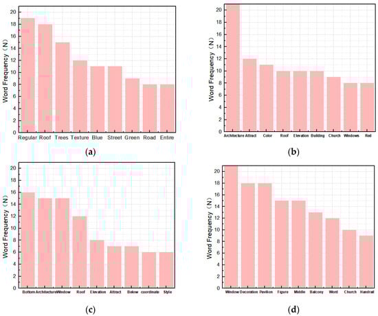 Results of word frequency analysis. (a) High-frequency words of urban texture. (b) High-frequency words of public buildings. (c) High-frequency words of arcade buildings. (d) High-frequency words of partial elevation.