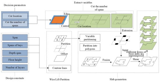 The internal spatial configuration of the library is essential for achieving optimal natural lighting distribution and spatial efficiency []. This section elaborates on the parametric modeling approach used to systematically generate the internal spatial morphology of the library. Figure 2 illustrates a schematic division of the internal floor area of the library, used as a foundation for the parametric generation of spatial forms.