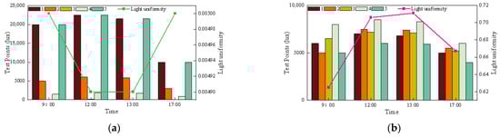 To evaluate the effectiveness of the proposed lighting optimization strategy, we used DIALux simulation results to compare the illuminance measurements before and after the optimization design was implemented. As shown in Figure 5, the illuminance distribution before optimization varied dramatically—up to 22,500 lux near the window and as low as 110 lux in the dark corner—resulting in poor uniformity (<0.1). After optimization, the simulation results showed that the lighting was balanced at all time periods (9:00, 12:00, 13:00, and 17:00), with the illuminance values at the five test points all remaining within 2000 lux and the uniformity ranging from 0.6 to 0.75.