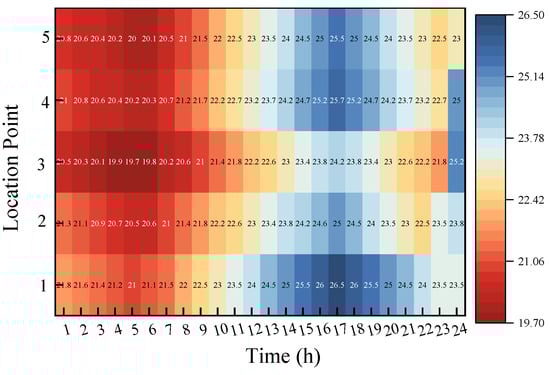 The modified window design is used in the reading area of the university library. Five locations are selected for measurement. Locations 1–5 are, respectively, near the window area, the center of the reading area, the door, and the left and right corners. The location temperature is recorded once an hour for 24 h. The origin drawing software is used to draw the temperature changes in the five locations. Figure 6 shows the temperature at different locations for each hour. The temperature at each location is between 21.5 and 23 °C in a day. The temperature difference is small and within 1 °C. This shows that the overall temperature distribution of the reading area is uniform after multi-objective optimization, and the natural light lighting design has achieved a good control effect on the temperature of the reading area.
