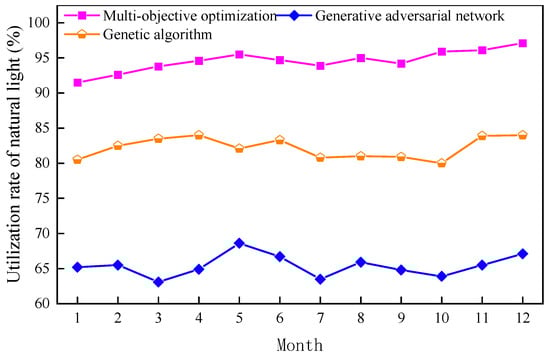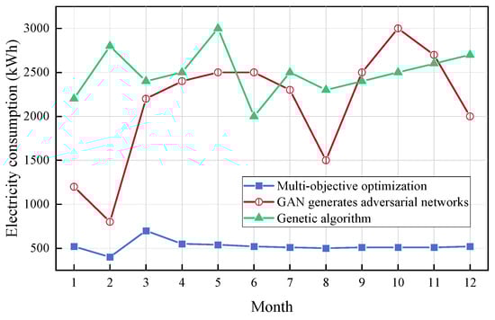In the DIALux simulation software, multi-objective optimization algorithm library lighting design natural light is sufficient, and it shows that the light source will be effectively distributed, reducing the use of lighting tools, Consequently, each month’s electricity energy consumption is low, generally around 500/kWh. In October, the generation of adversarial network optimization and genetic algorithm is higher than the multi-objective optimization algorithm, 2500/kWh compared to 2000/kWh, which not only ensures the needs of students at the same time but also saves energy and reduces the adverse impact on the environment. It contributes to the sustainable development of energy, reduces carbon emissions, lowers the operating costs of the library, and improves the economic efficiency of the library. And it helps the library to establish a green image, improve social recognition and honor, set an example for students in colleges and universities, and enhance students’ awareness of environmental protection.