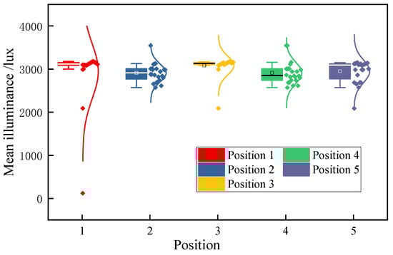 Illuminance uniformity is an important indicator for lighting design in natural light environments. The distribution of illuminance uniformity after optimization is shown in Figure 9. Within 24 h, the average illuminance/lux of the five locations is the highest at location 1, which is 3092.84/lux, and the lowest at location 4, which is 2970.68/lux. This average illuminance is close to the expected illuminance of 3101/lux after optimization. This confirms that the algorithm can achieve spatial lighting balance and reduce lighting differences.
