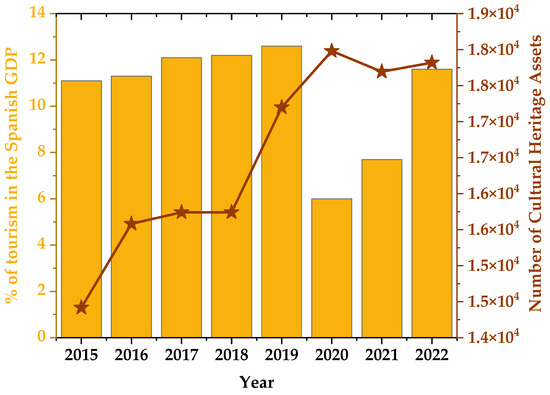 Number of cultural heritage assets recognized in Spain and % of tourism in the Spanish GDP from 2015 to 2022 [28].