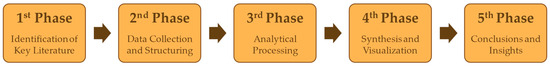 This review follows a bibliometric methodology structured into five distinct phases, as shown in Figure 2: (i) The first phase involves the identification of key literature, focusing on scientific articles. (ii) In the second phase, bibliometric data are systematically collected and structured for subsequent analysis. (iii) The third phase consists of data analysis and processing, employing various statistical and analytical techniques to identify patterns, trends, and relationships within the literature. (iv) The fourth phase involves the synthesis and visualization of the data, transforming findings into graphical representations to enhance interpretation. (v) Finally, the fifth phase focuses on drawing the main conclusions and insights from the study.