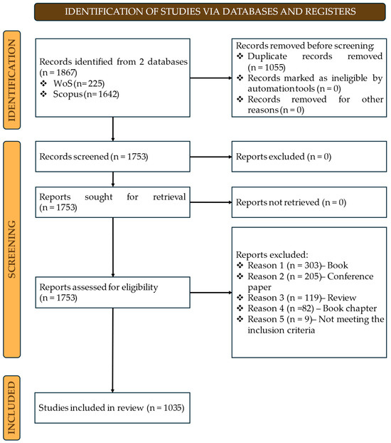 Continuing with the methodology, the second phase outlined in Figure 2 focused on selecting and systematically organizing the retrieved studies on universal accessibility in Spanish cultural heritage to ensure a structured and efficient subsequent analysis. To ensure a structured and transparent review process, the PRISMA 2020 framework was applied [29,30]. This framework is a key tool in bibliometric analysis, providing a systematic approach to literature selection [31]. Initially, a broad search was conducted, including journal articles, conference proceedings, and books to achieve comprehensive coverage. However, filtering was later refined to focus exclusively on peer-reviewed journal articles, as they ensure greater consistency and rigor in bibliometric research than conference papers, reviews, and book chapters. In this context, the PRISMA 2020 flow diagram enhances the transparency and reproducibility of the study selection process by visually outlining its key phases [32,33], as stated in Figure 3: (i) Identification: a total of 1897 records were retrieved from Scopus and Web of Science, with 114 identified as duplicates. (ii) Screening: no records were excluded at this stage, as all were considered relevant to the study. (iii) Eligibility: from the 1753 remaining records, 709 were removed for not being journal articles (303 books, 205 conference papers, 119 reviews, and 82 book chapters), while 9 additional records were excluded for not meeting the inclusion criteria. (iv) Inclusion: the final dataset comprised 1035 journal articles selected for bibliometric analysis, as can be seen in Table S1.
