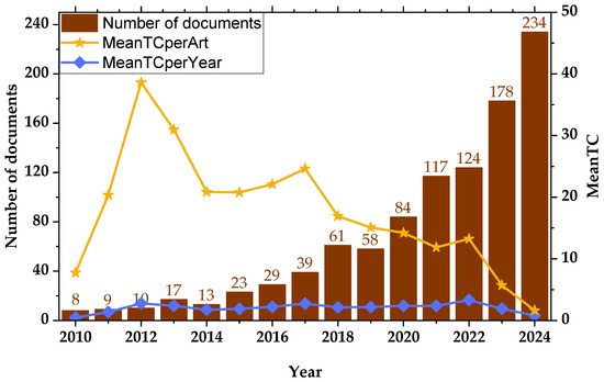 Annual scientific production and citation evolution (MeanTCperArt: mean total citations per article, indicating the average number of citations each publication has received; MeanTCperYear: mean total citations per year, showing the average annual citation rate across all publications for each year).