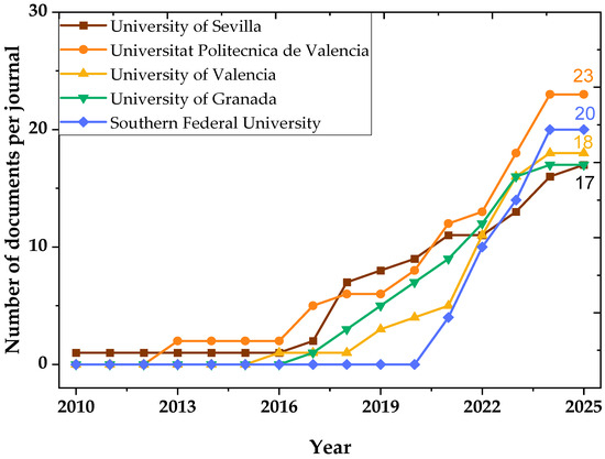 Figure 8 shows the evolution in the number of documents published by the five most frequent affiliations, all of them universities, between 2010 and 2025. As indicated above, a notable growth can be seen from 2018 onwards, with a more exponential increase in recent years. The University of Seville is positioned as the institution with the highest number of publications, followed by the Universitat Politècnica de València and the University of Valencia. The University of Granada and the Southern Federal University also show an upward trend, although with a lower volume of publications. In this sense, as might be expected, the four institutions that publish the most on the subject are Spanish.