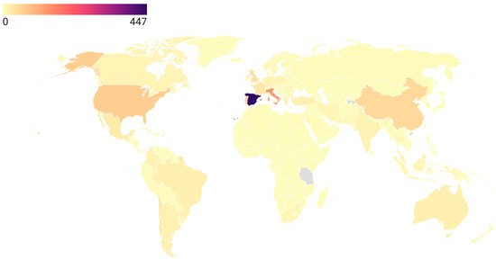 Figure 10 shows the countries of the corresponding authors together with the total number of citations and the average number of citations per article, and Figure 11 presents the most cited countries in this field of study. Spain leads in total citation volume with 2154 citations, followed by Italy (1149 citations) and China (709 citations). However, when analyzing the average impact of each article, it is observed that Australia has the highest average with 24.9 citations per article, suggesting that its publications have a high impact on the academic community. China (13.7 citations per article) and Italy (12.1 citations per article) also stand out in this regard. In contrast, although Spain leads in citation volume, its average per article (8.4) is lower compared to other countries. In this regard, the countries most frequently cited—Spain, Italy, and China—align with those producing the highest volume of research, reinforcing their role as reference points in the academic development of this field.