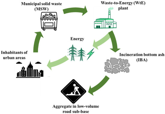 The potential applications of weathered IBA in engineering are extensive and varied. Its primary appeal lies in its particle size distribution and composition, which includes glass, ceramics, stone, brick, concrete, and melting products [23]. Despite its high heterogeneity, weathered IBA is considered a silica-rich material with significant amounts of calcium and aluminum, making it comparable to natural sand or gravel [24]. Its main use is in civil and construction engineering, where it serves as a secondary aggregate material for road construction [25,26], embankments [27,28], pavements [29], land leveling, landfill cover, and the restoration of areas degraded by extractive activities, as well as for concrete filling [30]. Due to its high glass content and brittle ceramics, IBA has a relatively low mechanical strength as a secondary aggregate. Consequently, its use in construction and civil engineering is limited to applications with minimal performance requirements, such as sub-base layers for low-volume roads or industrial park streets, typically located away from urban centers (Figure 1).