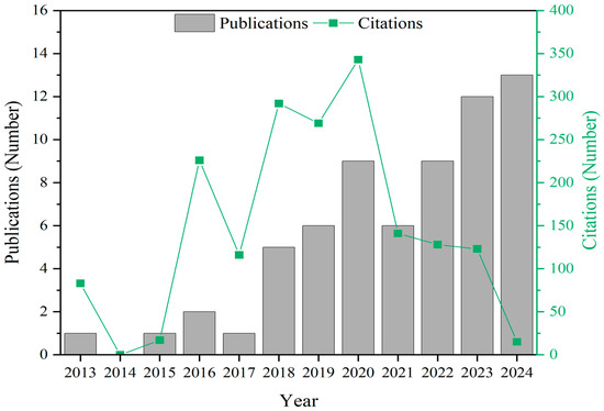 To quantitatively evaluate the relevance of using IBA as a precursor in the formulation of AABs and to contextualize the conducted research, a bibliometric study was performed, covering the period from 2013 to mid-2024. These studies use mathematical and statistical methods to assess the impact and progression of scientific research through various indicators, involving a quantitative analysis of publications. The methodology used in this bibliometric study extends the approach previously developed by the authors in earlier research [37]. Several keywords and phrases were identified to determine the appropriate search terms for this study. The main keywords were: “MSW”, “bottom ash”, “alkali cement”, “alkali binder”, and “geopolymer”. The review includes all publications focusing on the alkali activation of IBA for developing building materials, such as pastes, mortars, and aggregate-based materials. The data source selected for this study was Scopus from Elsevier. Additionally, only scientific articles and conference proceedings were included when filtering the results from these databases. The search results were manually sorted by title and abstract.