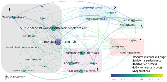 The map of keyword co-occurrences, as defined by the authors in the analyzed publications, illustrates the relationships between the various keywords (Figure 3). The size of each circle indicates the number of articles in which the keyword appears, while the lines connecting the circles represent the co-occurrence of the keywords. The thickness of each line is proportional to the number of documents that use both keywords. Alongside the keywords related to the materials generated during the incineration process, such as “municipal solid wastes incineration bottom ash” and “incineration bottom ash”, the four most significant keywords in the publication are “alkali-activated materials”, “geopolymer”, “alkali activation”, and “alkali-activated binders”. The co-occurrence of these keywords underscores the extensive use of IBA as a precursor in the formulation of AABs. Additionally, the absence of the keywords indicative of advanced technological stages typically associated with industrial implementation highlights the low Technology Readiness Level (TRL) of the current research. Most investigations have been conducted primarily at the laboratory scale, focusing on the critical parameters influencing the formulation of AABs. Special attention has been given to microstructural analysis using advanced characterization techniques, including scanning electron microscopy coupled with energy-dispersive X-ray spectroscopy (SEM-EDS), Fourier transform infrared spectroscopy (FT-IR), X-ray diffraction (XRD), and thermogravimetric analysis (TGA). Furthermore, the mechanical performance of these materials has been extensively evaluated in most studies, mainly through the determination of compressive strength.