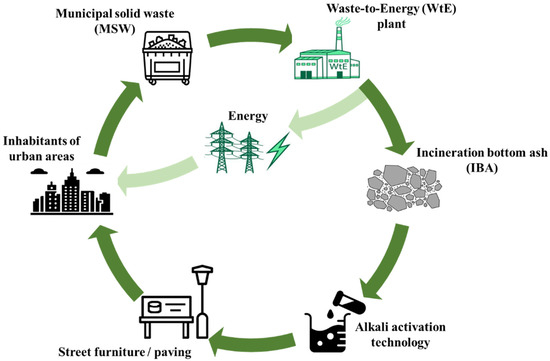 Innovative approaches in the Portland cement industry, aligned with circular economy principles, offer a promising solution to reduce the environmental impacts. These methods can initially target the architectural elements with lower structural demands, such as urban furniture and paving, before being applied to areas with higher cement usage. Alkali-activated binders (AABs) made from secondary resources present a sustainable alternative to Portland cement (PC), promoting resource recovery, conservation, and a low-carbon economy. Incinerator bottom ash (IBA), traditionally landfilled, has shown potential as a precursor for AABs due to its aluminosilicate content. Repurposing IBA for urban furniture and paving transforms it into a valuable secondary resource. Accordingly, this is the first study to utilize IBA as the sole precursor for urban furniture or paving applications. Research, including state-of-the-art studies and proof of concept developed in this work, demonstrates that IBA-based AABs can produce cast concrete suitable for non-structural urban elements, meeting the technical, environmental, and ecotoxicological standards. Using IBA in AAB formulations not only reduces the reliance on primary raw materials but also contributes to significant energy savings in binder production and lowers greenhouse gas (GHG) emissions, resulting in a reduced carbon footprint. Furthermore, producing concrete from local residual resources, such as IBA, facilitates the reintegration of municipal waste into the production cycle at its point of origin, fostering a sustainable approach to urban development and supporting the circular economy.