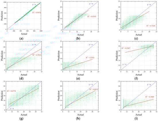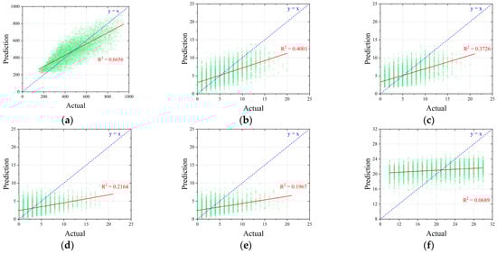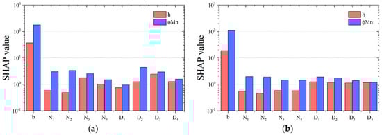 - In the two datasets, the coefficients of determination for b were 0.9978 and 0.6656, respectively, indicating the highest prediction accuracy among all the output variables. This result suggests that b has the most linear relationship with the input variables h and . In contrast, the R2 values for nR1–4 and D1–4 were relatively lower, indicating more nonlinear prediction behavior. This can be attributed to the fact that multiple combinations of nR and D can resist the same , illustrating the presence of diverse solution patterns in the design of RC beam cross-sections and the complex interactions among design variables.