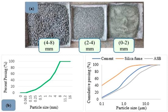 Andesite was used as fine aggregate, and basalt was used as coarse aggregate, and they were classified as (0–2) fine-1, (2–4) fine-2, and (4–8) coarse mm. The particle size distribution of the aggregate, cement, ASB, and SF materials used in the study is presented in Figure 1.