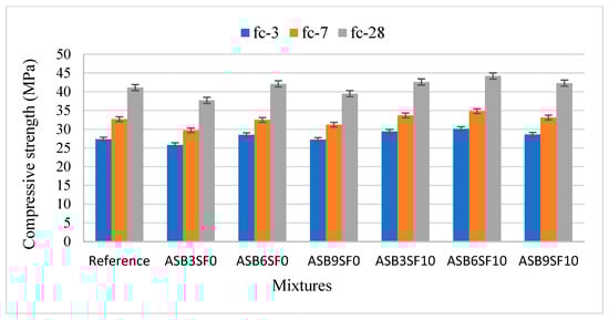 - Replacing approximately 6% of ASB with cement provides higher compressive strength at all curing ages. At the same time, the addition of a second mineral admixture, SF, further improves the strength value. The combined use of 6% ASB and 10% SF provided the best compressive strength result. Therefore, this ratio will guide researchers in the use of agricultural and industrial waste and prevent the need for numerous trial mixtures. This will result in significant savings in time, cost, and labor.