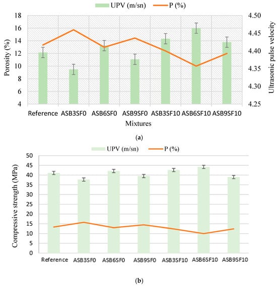 After a 28-day standard curing period, porosity and UPV tests were performed on the concrete specimens (Figure 6). Upon examining Figure 6a, a similar trend in compressive strength was observed in the ASB6SF10 series, which had the lowest porosity and highest UPV value. With the increase in ASB content and the addition of SF, the microstructure of the concrete reaches a higher compactness, which leads to a decrease in porosity. Due to their chemical structure, biochar reduces the formation of ettringite in concrete and ensures that the concrete has a denser structure [41,42,43].