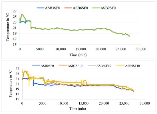 Figure 7 shows the 28-day temperature change of the concrete series. Upon examining the graph, we can observe that the heat release of the ASB-SF-added concrete series is higher than that of the other series. When comparing the series without SF addition to those with SF addition, it is evident that the hydration reactions have accelerated and heat release has increased due to the addition of silica fume. In parallel with the compressive strength results, it is clearly seen that the highest temperature value is in the ASB6SF10 series.