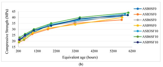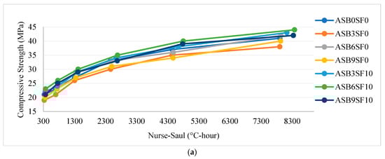 When examining Figure 8, it is observed that the maturity index depends on curing age and curing temperature and plays an important role in predicting early age strength. [28,50]. It has been observed that as the compressive strength value increases as specified in the C1074 standard, the maturity values also increase linearly. The lowest maturity value was observed in the ASB3SF0 series, where the temperature change value was also low. This indicates that hydration continues with increasing temperature, leading to greater C-S-H gel formation and consequently higher compressive strength values [51].
