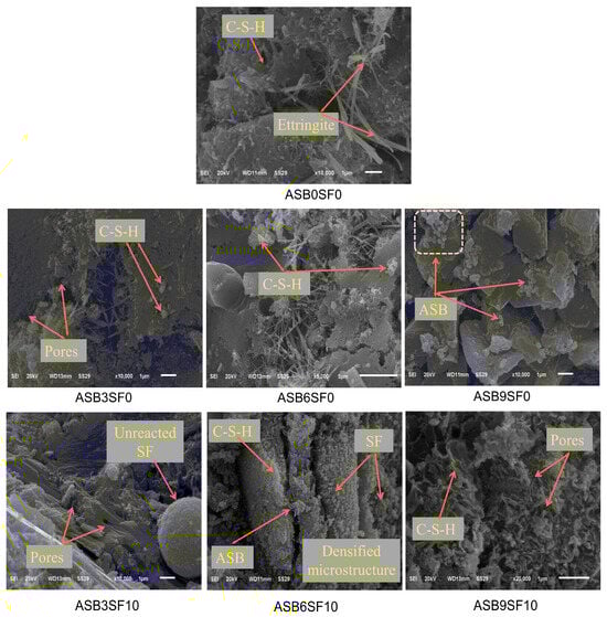 Figure 9 shows the analysis of hydration products, which is an important aspect of microstructure studies. Pores, ettringite formations, and C-S-H were observed in the reference mixture. The addition of ASB and SF supported C-S-H formation and contributed to the filling of pores. As the ASB ratio increased in the series containing 0% SF, ridges and, some material accumulated in piles. Due to the pile-up formed with the increasing ASB ratio, hydration could not occur sufficiently, and after a certain ratio, this situation caused a decrease in strength [52,53]. When the reference series is examined, it is seen that there are pores and cracks, and the addition of ASB supported C-S-H gel formation and created a filling effect in the cracks.