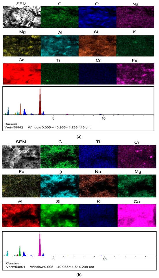The analysis conducted based on the SEM-mapping scan results determined the element concentrations within the material (Figure 10). In the SEM mapping graph of the reference series, the weight percentages of elements such as Carbon (C), Oxygen (O), Sodium (Na), Magnesium (Mg), Aluminum (Al), Silicon (Si), Calcium (Ca), and Iron (Fe) are approximately 7.76%, 41.02%, 0.35%, 2.29%, 3.52%, 10.0%, 31.95%, and 2.61%, respectively. In the SEM-mapping graph of the ASB6SF10 series, the weight percentages of elements such as Carbon (C), Oxygen (O), Sodium (Na), Magnesium (Mg), Aluminum (Al), Silicon (Si), Calcium (Ca), and Iron (Fe) are approximately 6.24%, 39.20%, 0.96%, 1.52%, 2.97%, 11.28%, 35.09%, and 1.87%, respectively.