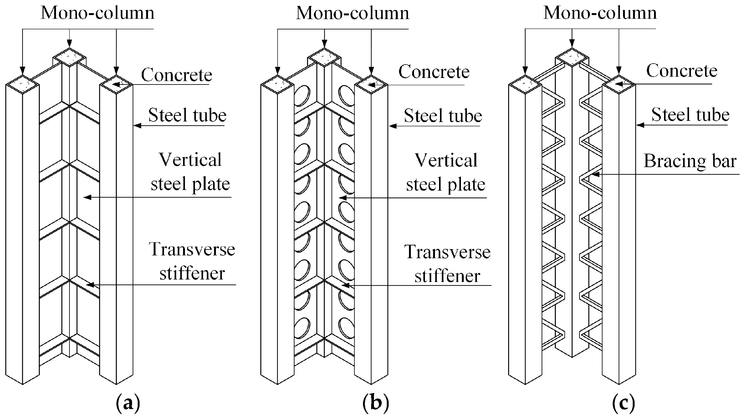 - Zhou, T.; Yang, Z.; Chen, Z.; Yu, Y. Seismic behavior of connections between H-beams and L-shaped column composed of concrete-filled steel tube mono-columns connected by double vertical plates. J. Constr. Steel Res. 2022, 198, 107513. [Google Scholar] [CrossRef]