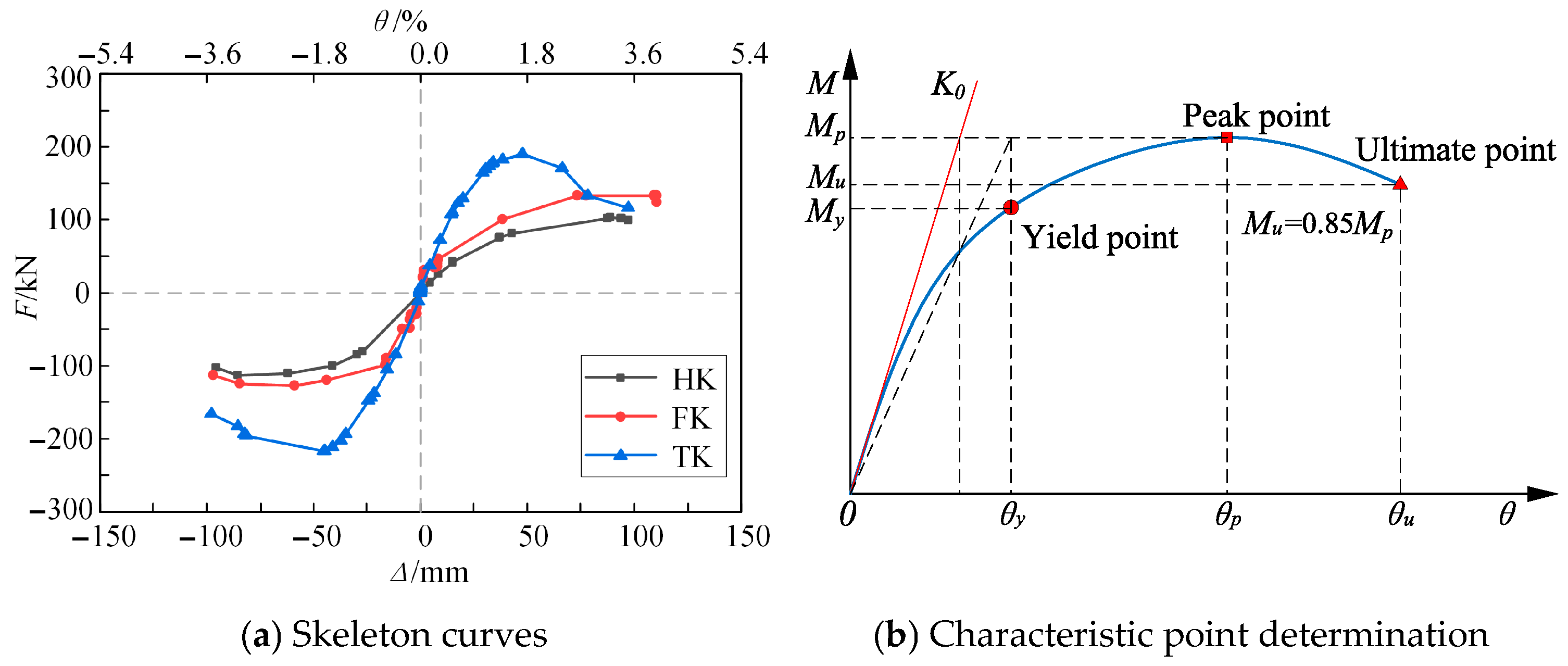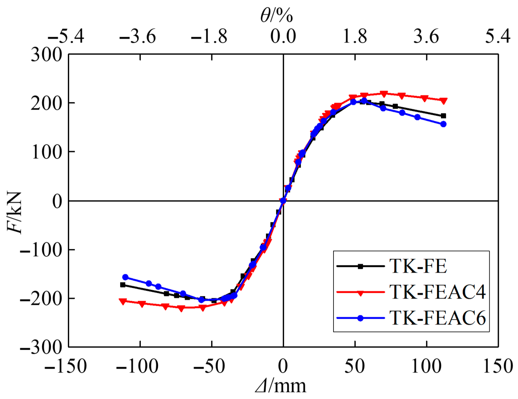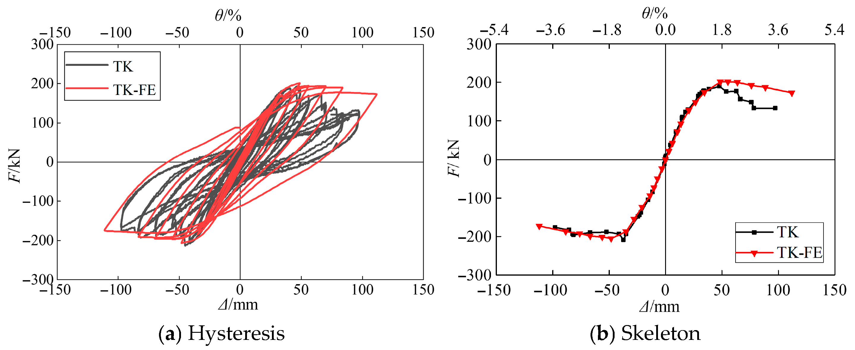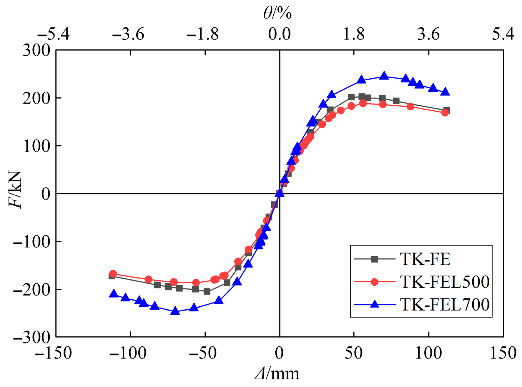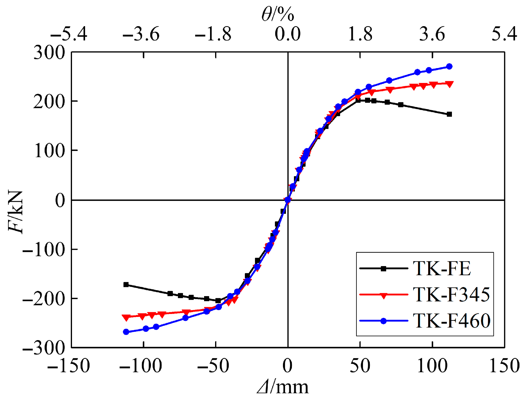 - Specimen TK: The hysteretic curve displayed a reverse S-shaped form with moderate pinching. Although the steel consumption of TK was similar to that of HK, its initial stiffness and load-carrying capacity were substantially higher than those of HK and FK. After reaching the peak load, the load decreased in a stepped manner with only minor reductions. The specimen sustained a high load-carrying capacity even as deformation continued to increase.