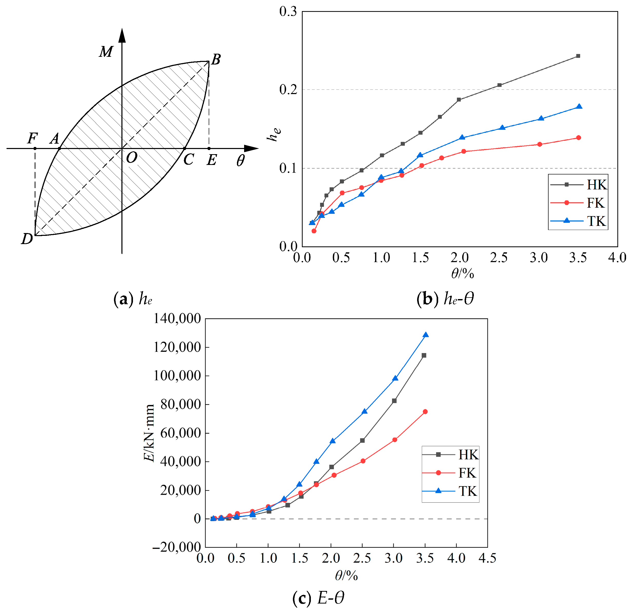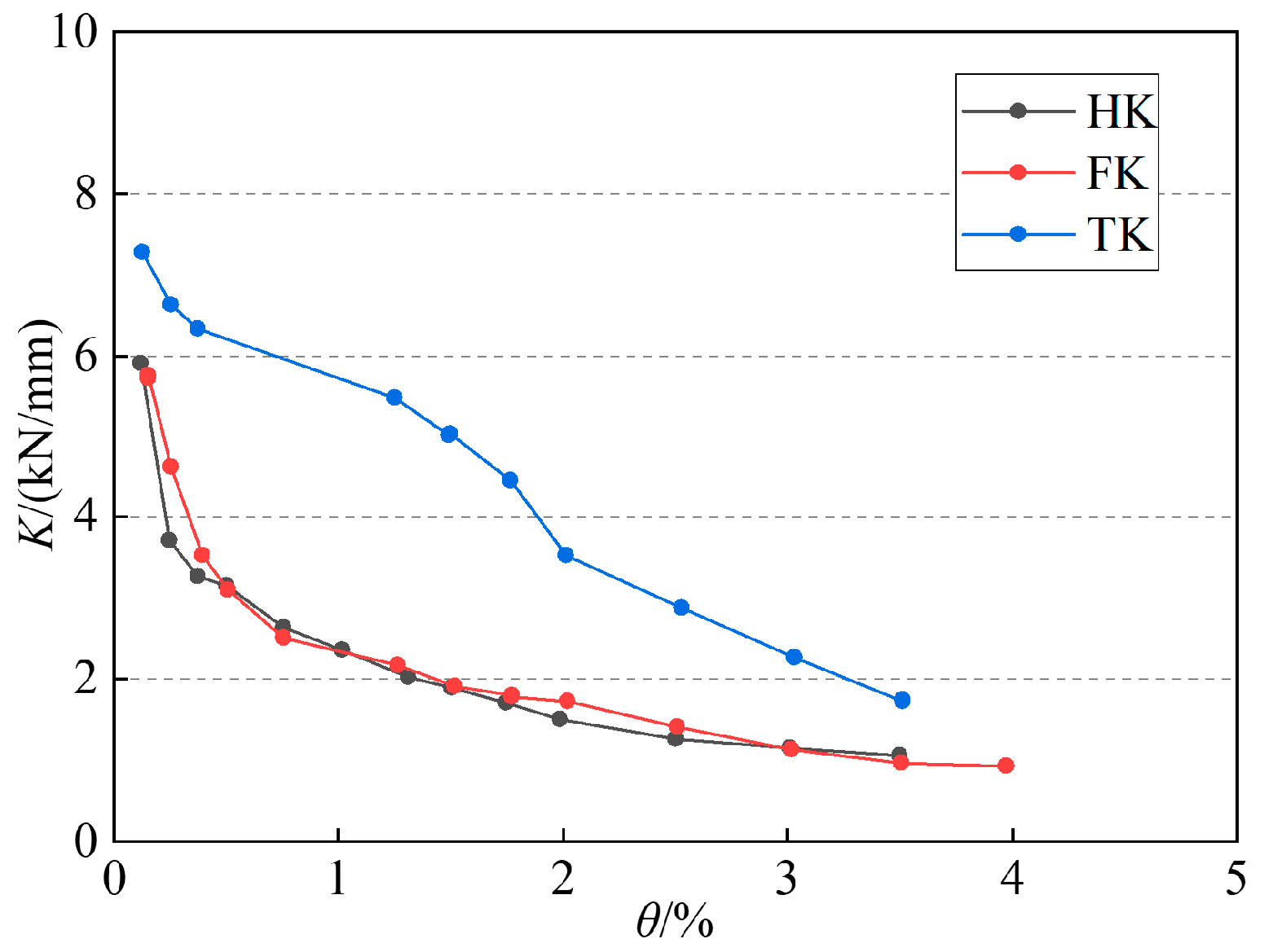 - Specimen HK: The hysteretic curve exhibited a spindle-shaped and relatively full form. As θ increased, the slope of the line connecting the peak points of each hysteresis loop to the origin gradually decreased, indicating continuous stiffness degradation. After yielding, the load reduction was not pronounced.