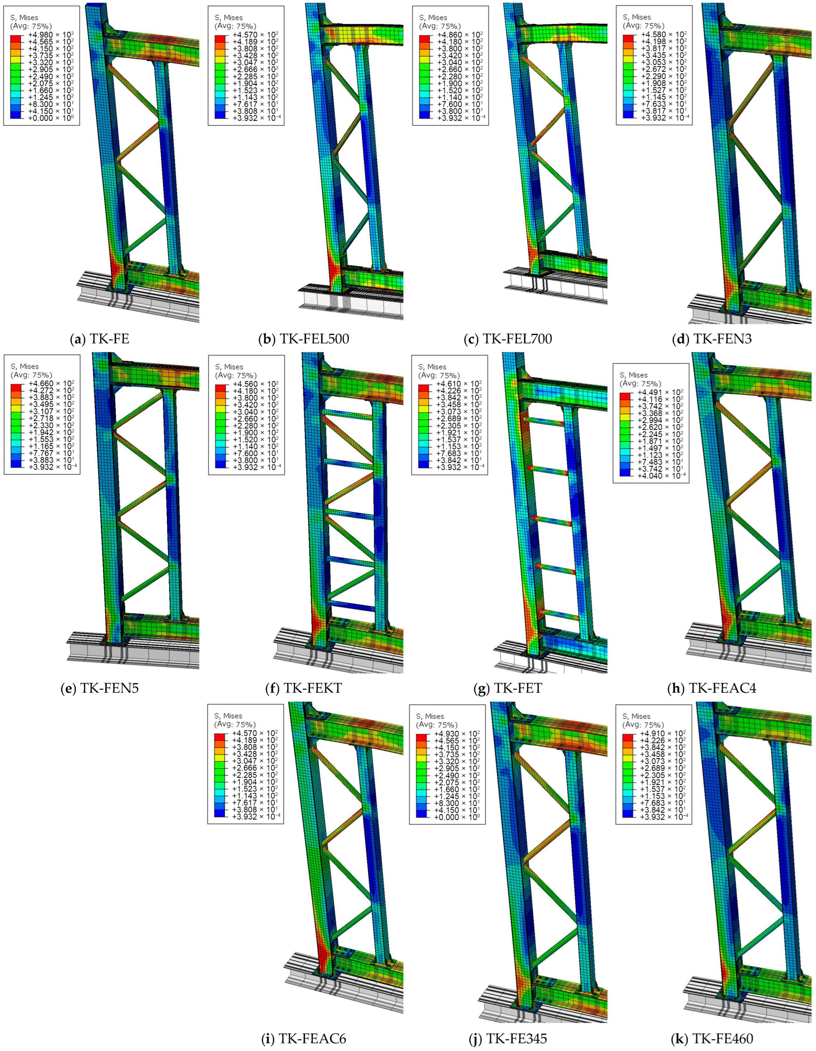 - FE analysis indicated that: increasing the spacing between the corner and end columns improved the lateral stiffness and load capacity of the TK; the number of truss diagonal bars had minimal influence on the peak load; replacing K-type joints with KT-type or T-type joints increased the yield and peak loads by approximately 10% without affecting lateral stiffness; increasing the axial compression ratio produced modest gains in load capacity (within 10%), whereas excessively high ratios impaired structural performance; and steel strength exerted a substantial influence on load-carrying capacity and should be selected with due consideration of economic factors in design.