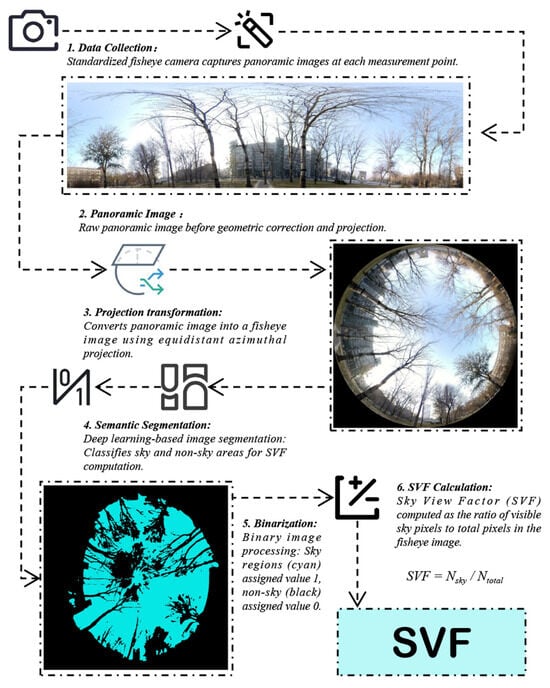 To obtain the SVF at each measurement point, panoramic images were first captured at designated sampling dates using standardized fisheye lens equipment. Compared to traditional simulation-based methods (e.g., using simplified geometric blocks in ENVI-met), estimating SVF from street-level imagery offers a more realistic representation of the physical environment, as it captures the intricate and irregular branching structures of vegetation. This method has been validated for high-density urban contexts and proven to yield higher correlation with ground-level radiation measurements [20].