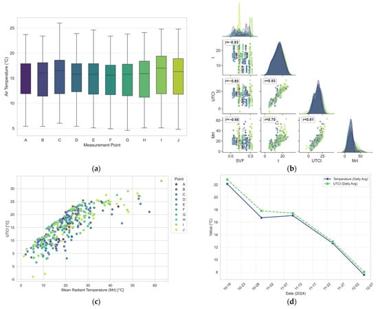 (a) Boxplot of Temperature Distribution Across Measurement Points; (b) Spearman’s Correlation Among Meteorological Variables and UTCI; (c) Scatter Plot of MRT and UTCI; (d) Daily Mean Temperature and UTCI Seasonal Trends (October–December). Note: SVF showed significant negative correlation with UTCI (ρ ≈ −0.8).