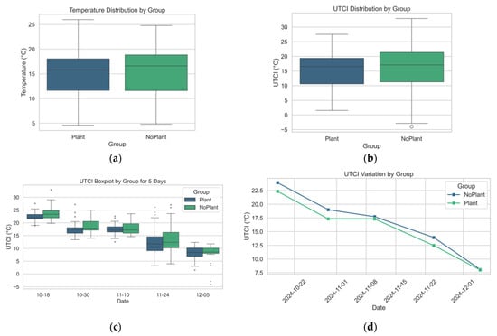 As shown in Figure 8a,b, the overall distributions of temperature and UTCI exhibit discernible differences between the two groups. The median values in the boxplots for the Non-plant-affected Group (NoPlant) are generally higher than those for the Plant-affected Group (Plant), suggesting that areas with minimal vegetation-induced shading changes tended to experience higher air temperatures and UTCI values during most observation periods.
