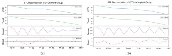 Second, considering the inherent periodicity in meteorological data, Seasonal-Trend Decomposition using Loess (STL) was employed [23]. This non-parametric method decomposes the original time series of SVF and UTCI into three additive components: a long-term trend (reflecting seasonal progression), a seasonal component (reflecting diurnal cycles), and a residual component (random noise). This decomposition allows for the isolation of the “phenological trend” from daily meteorological fluctuations.
