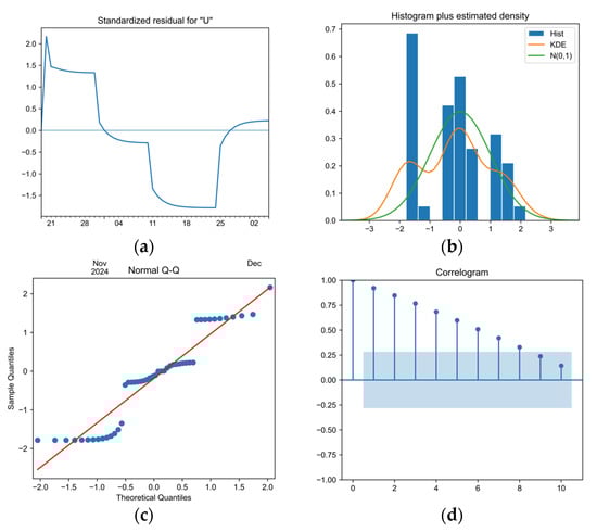Diagnostic plots of residuals from the ARIMAX model, including (a) standardized residuals, (b) histogram with kernel density and normal distribution curves, (c) normal Q-Q plot, and (d) correlogram.