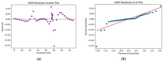 During model development, sensitivity analysis of the spline degrees of freedom was performed by varying the number of splines and the penalization parameter (λ), ensuring that the results remained stable across different parameter settings. Upon completion of model fitting, the pseudo-R2 reached 0.9998, indicating that the GAM effectively captured complex nonlinear relationships between variables after removing the influence of overall climatic background conditions. Diagnostic evaluations, including residual scatter plots (Figure 12a) and Q-Q plots (Figure 12b), confirmed the randomness and approximate normality of the residuals. In addition, the model’s predictive performance was validated through k-fold cross-validation, further reinforcing the robustness and reliability of the GAM approach.