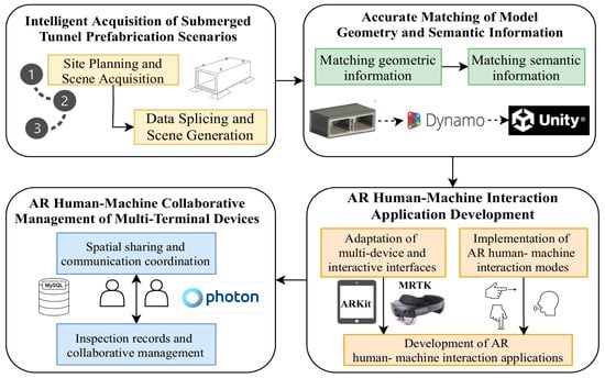 The contributions of this work are threefold. Theoretically, it extends human–machine collaboration research to the context of submerged tunnel prefabrication. Methodologically, it develops an integrated BIM-AR framework covering scene modeling, geometric–semantic alignment, AR interaction, and multi-terminal collaboration. Practically, it offers an engineering-validated workflow that improves the accuracy and efficiency of pre-embedded component installation.