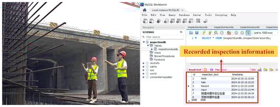 During the construction of pre-embedded components for submerged tunnel, construction personnel, quality inspectors, and managers are often dispersed across different areas. This necessitates real-time collaborative sharing for component status updates, issue logging, and information feedback. In field experiments, construction personnel completed component status updates and issue logging on HoloLens 2 devices. Other users could view these updates in real time on iPad devices and perform subsequent operations such as filtering and querying. The experimental setup and database information recording are illustrated in Figure 14. Results indicate consistent content display across all terminals. The HoloLens 2 system response exhibited a frame rate range of 34.6–44.8 fps, meeting application requirements for information responsiveness. Concurrently, inspection data recorded across multiple terminals was centrally managed within the database, significantly enhancing information sharing and communication efficiency at the project site.