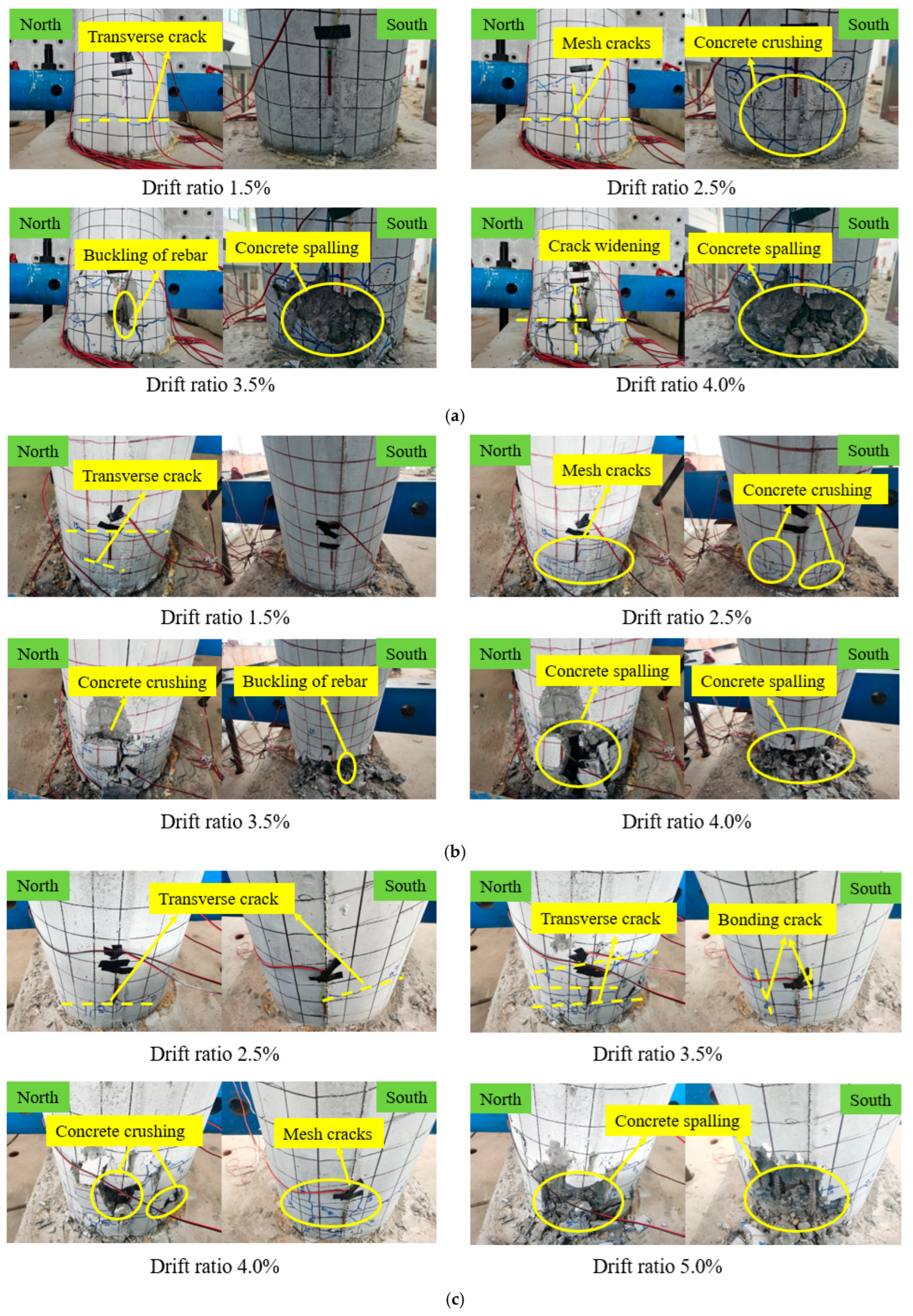 reaches 1.5%, a transverse main crack emerges in the concrete on the specimen’s north side due to tensile stress. As the drift ratio increases, this transverse main crack extends toward the east and west sides, while new horizontal and vertical cracks continue to develop, forming a network. When the drift ratio