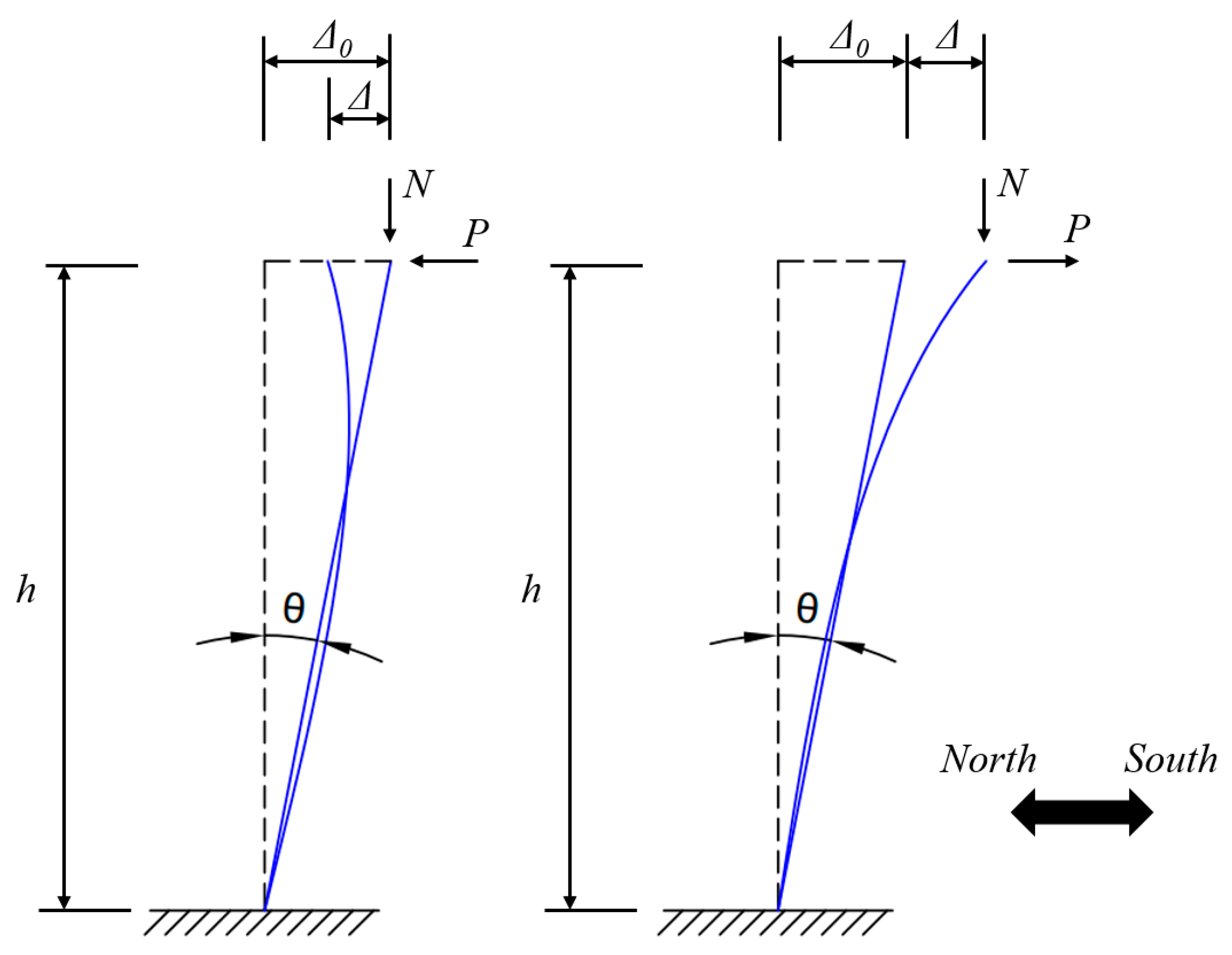 denote the second-order bending moment effects resulting from northward and southward loading, respectively. During the loading process, the lateral reciprocating displacement