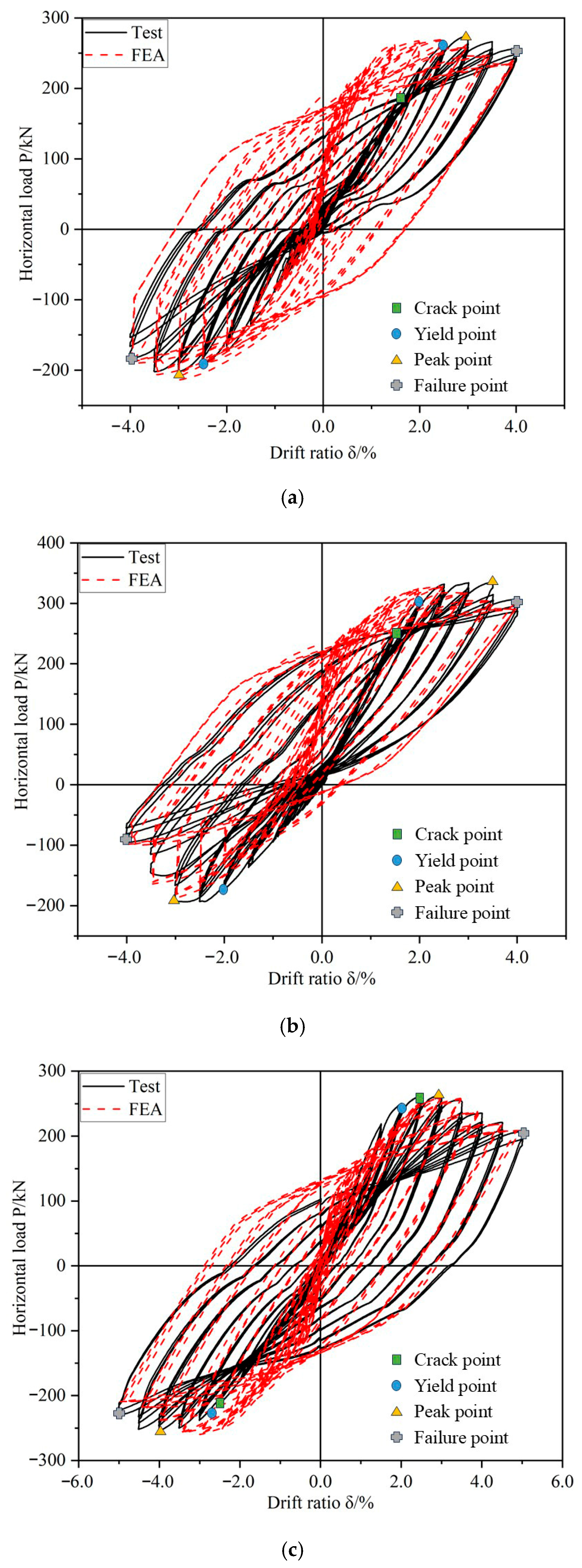 29], indicating that the inclusion of section steel in the specimens significantly enhances the hysteretic performance of the columns, enabling them to withstand strong earthquakes. Additionally,