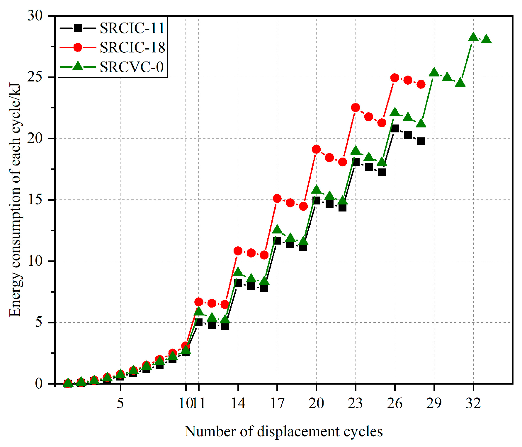 curve for the SRCIC-18 specimen remains consistently higher than those of the other two specimens. It is important to note that SRCVC-0 has undergone 33 displacement cycles, whereas SRCIC-11 and SRCIC-18 have only experienced 28 displacement cycles. Consequently, upon final failure, the cumulative total energy consumption of SRCVC-0 was 1.69 and 1.34 times greater than that of SRCIC-11 and SRCIC-18, respectively. This indicates that the energy dissipation performance of vertical columns is superior to that of inclined columns. Nevertheless, the energy dissipation performance of inclined columns during each stage of the loading process is not inferior to that of vertical columns.