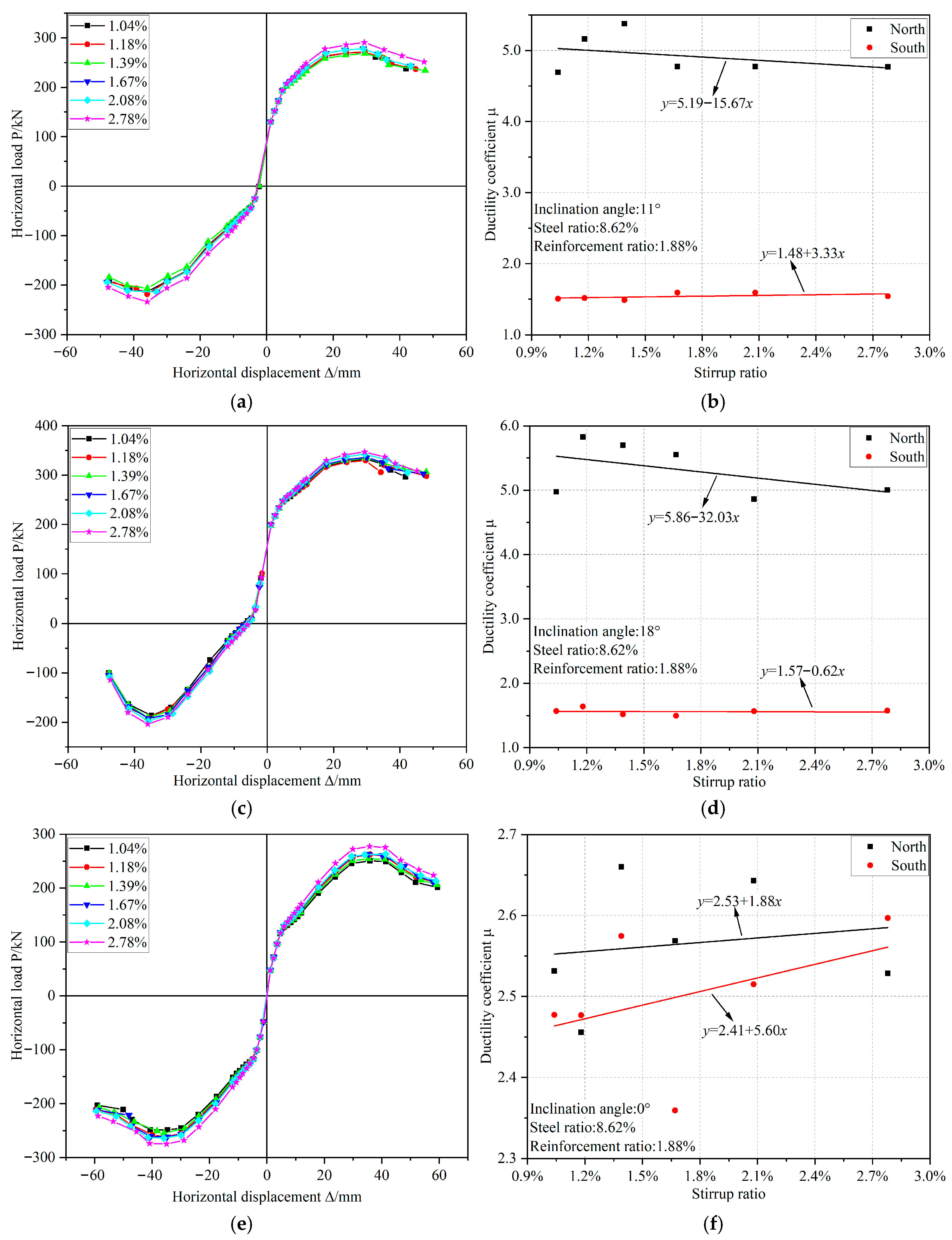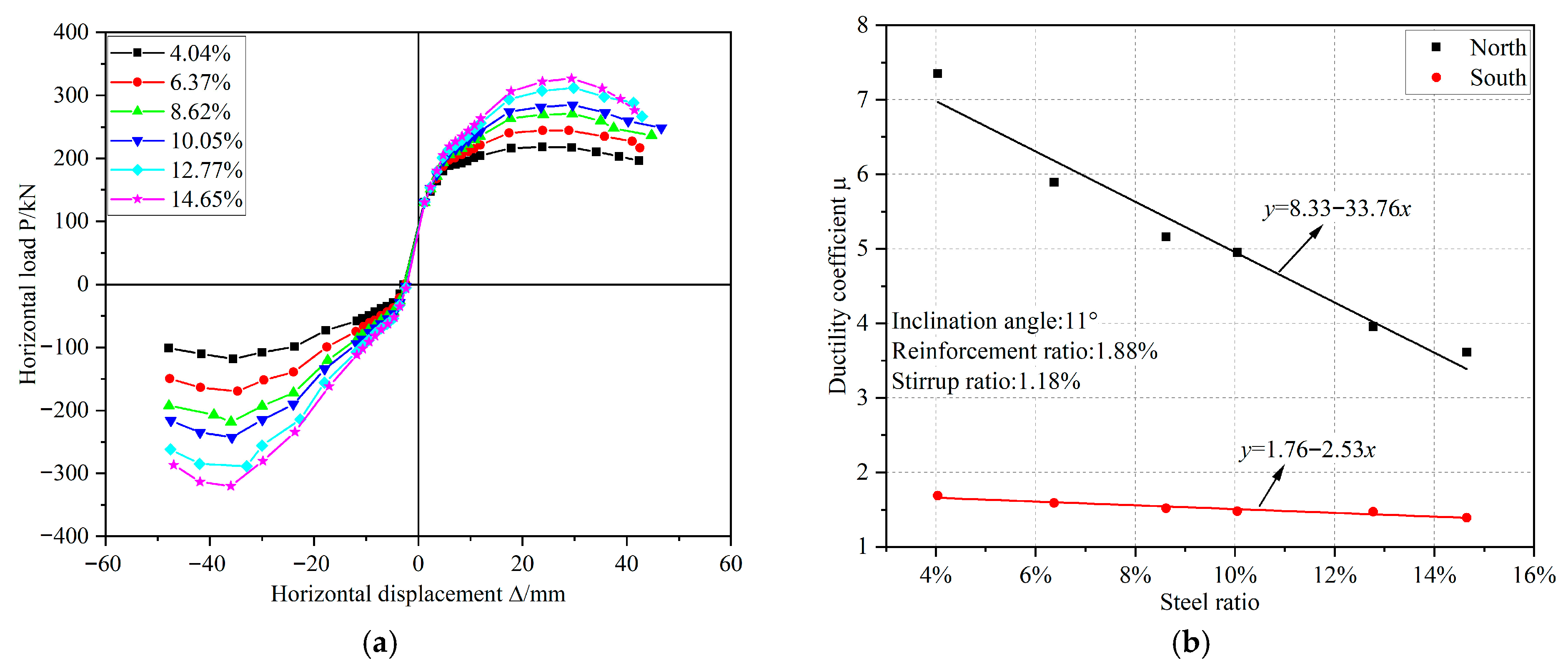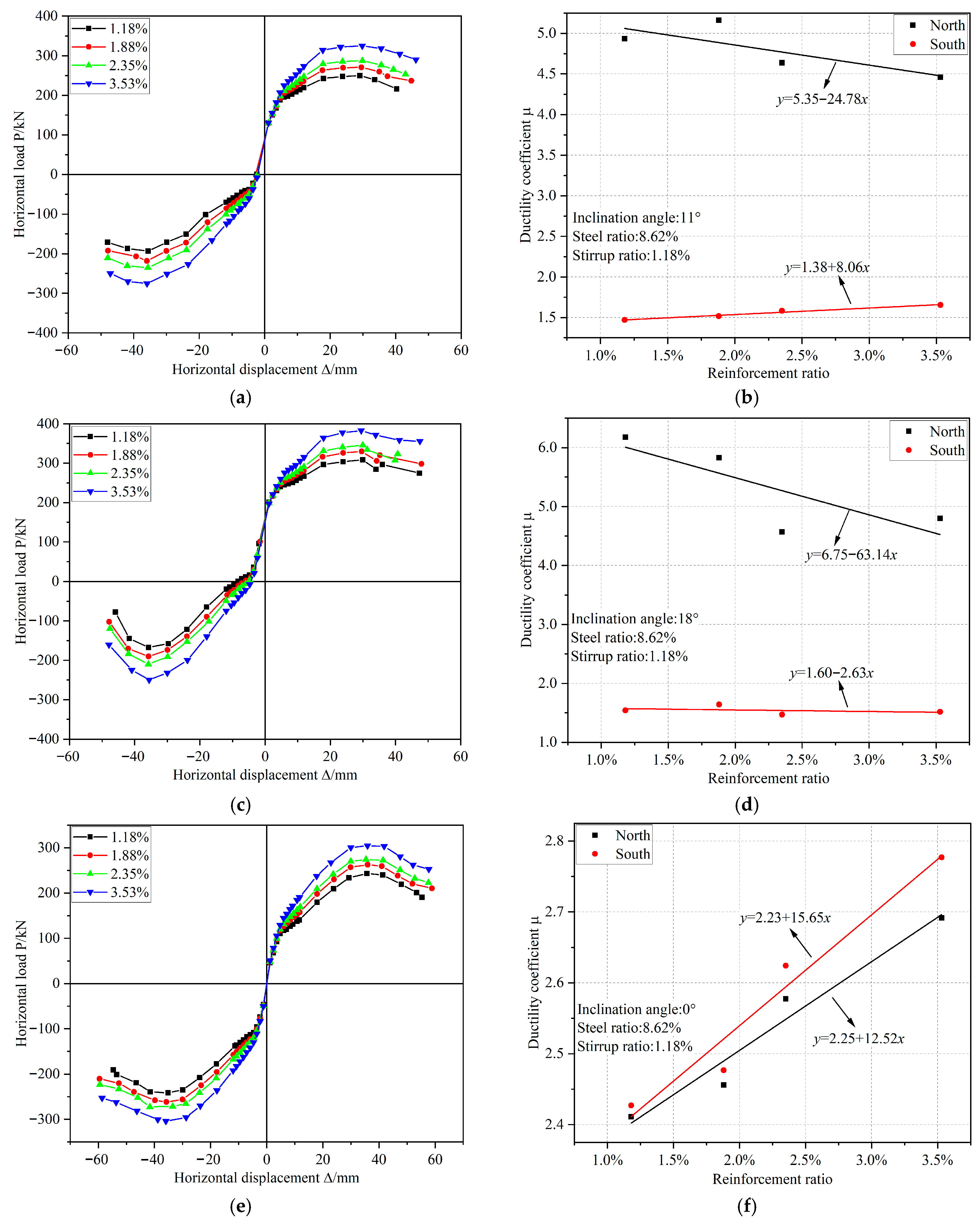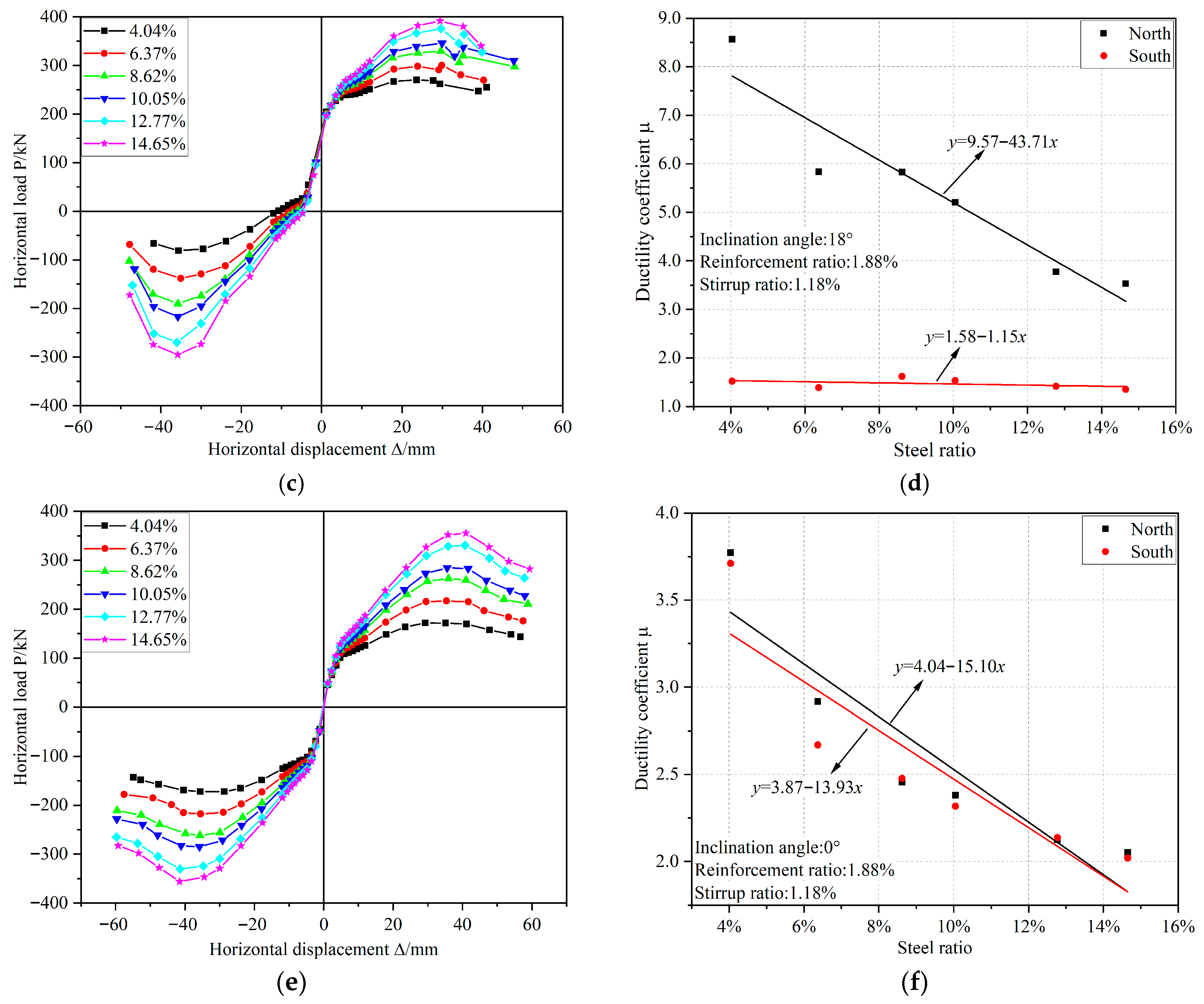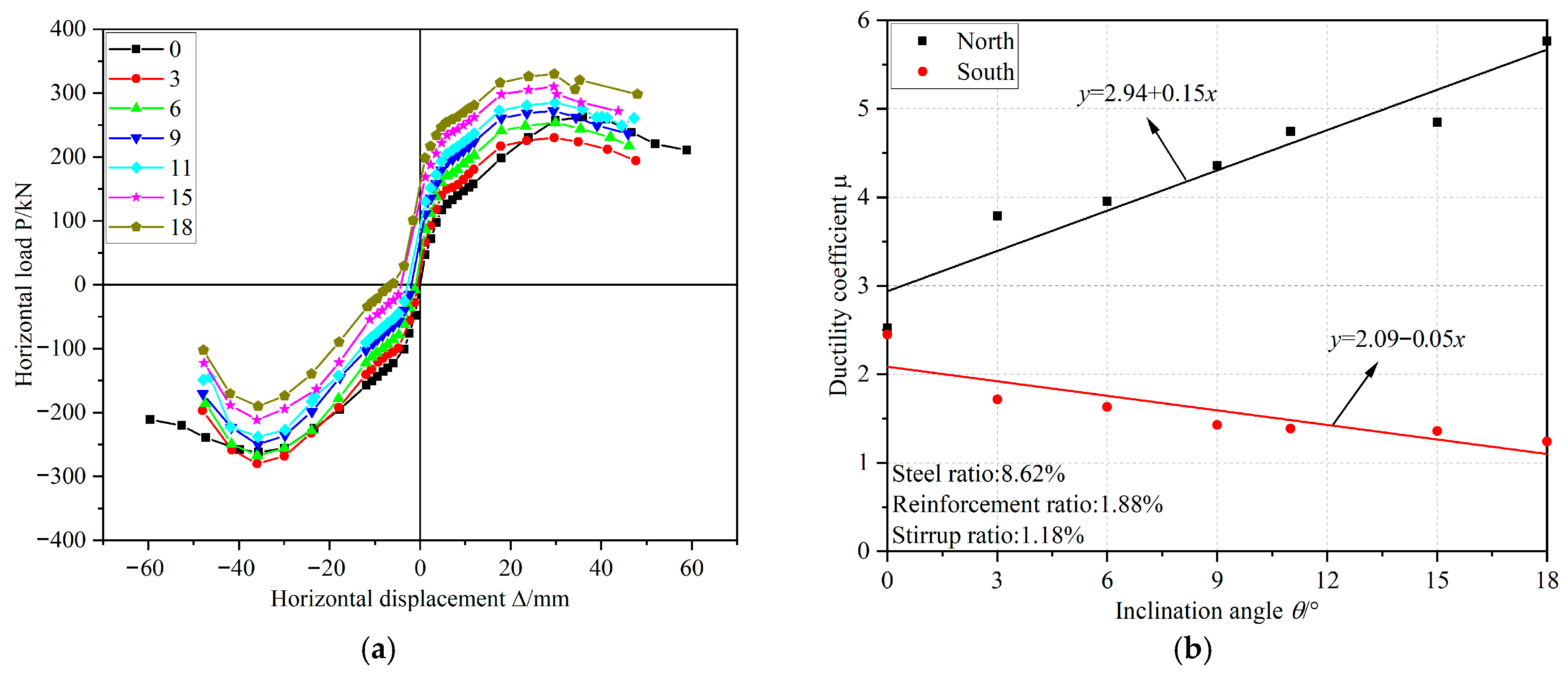 Figure 14b, the ductility coefficient for northward consistently increases, whereas the ductility coefficient for southward continues to decrease, exhibiting an approximately linear relationship with the inclination angle. This fitting formula can be employed to predict the ductility coefficient values of inclined columns at different inclination angles.