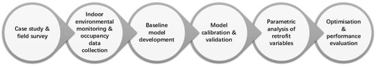 This study was conducted in three phases (as shown in Figure 1). In the first phase, general data of the study house, including building measurements and construction characteristics were collected. Environmental variables, including indoor dry-bulb temperature and relative humidity, were measured through a 24-month indoor environmental monitoring study, and occupancy patterns were documented based on occupant responses to interviews, later translated into simulation operation schedules. In situ testing (e.g., blower door tests, infrared thermography, or U-value measurements) was not feasible in the tenanted dwelling due to access limitations and the intrusive nature of such measurements, which would require disruption to occupants and partial disassembly of existing building elements. Envelope properties and infiltration rates were therefore initially constrained to credible ranges for comparable housing typologies and later refined during model calibration.